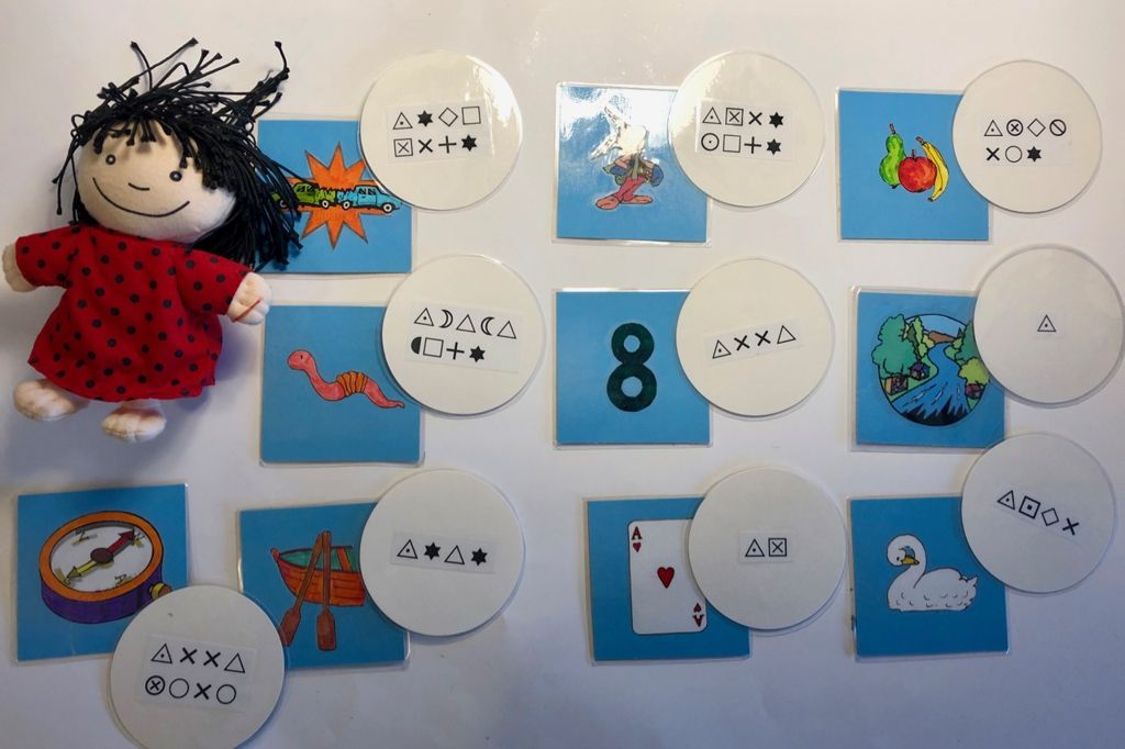 Á-sagan er dæmi um sögu þar sem er næstum því ómögulegt er að finna 10 hluti til að setja í töfrapokann. Lausnin sem ég fann var að hafa myndspjöld í töfrapokanum en til að hafa það aðeins meira spennandi eru orðin skrifuð með álfaskrift og börnin para saman táknin á myndaspjöldunum við táknin sem eru uppi á kastalanum.