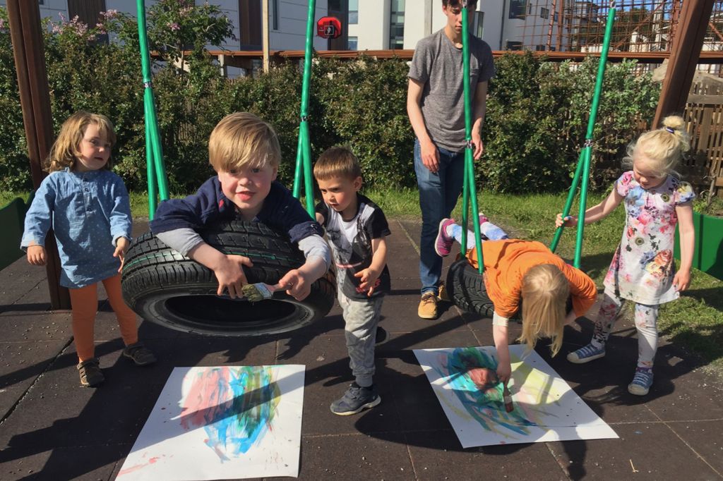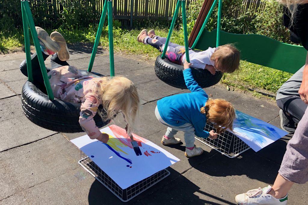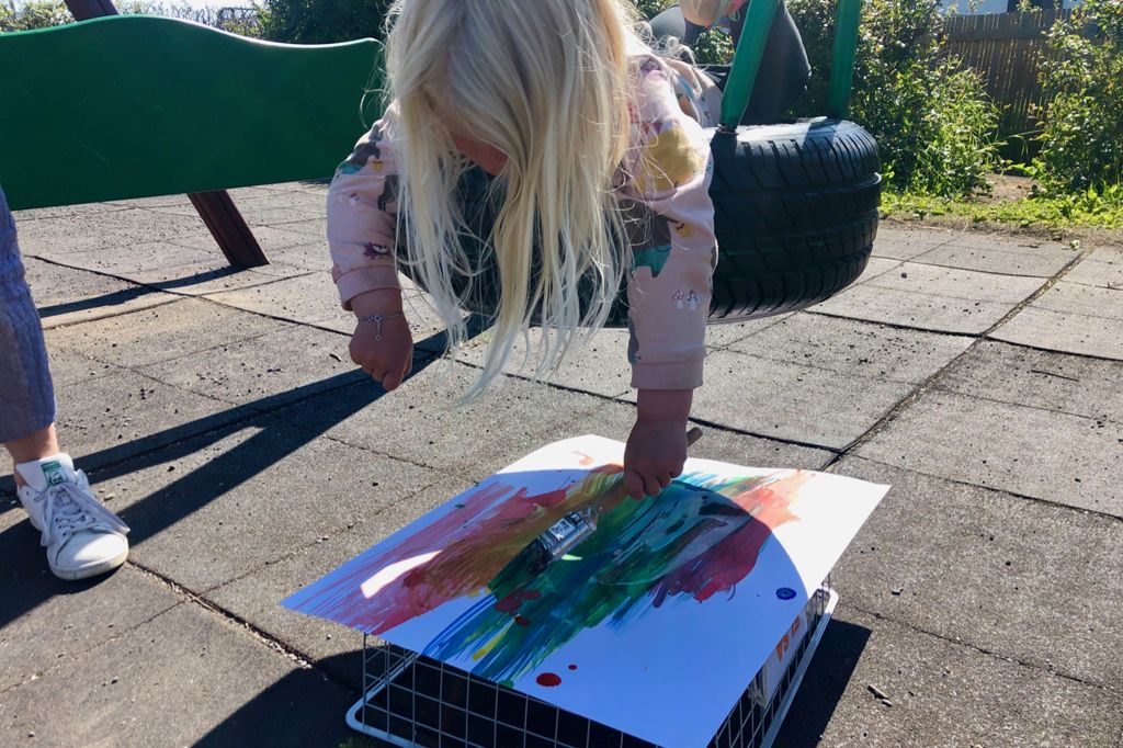 Hvernig ætli það væri að flúga um á kústskafti og mála allan heiminn? Besta og öruggasta leiðin til að komast að því er einfaldlega að leggjast á magann í dekkjarólu og láta hreyfingarnir stjórna penslinum og málverkinu.