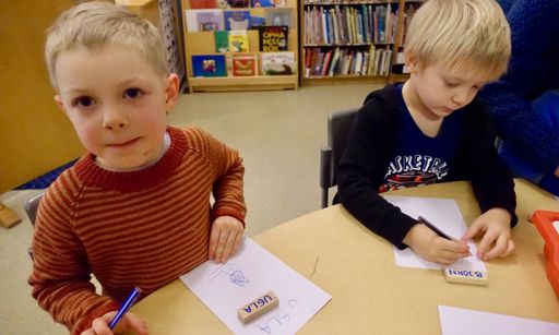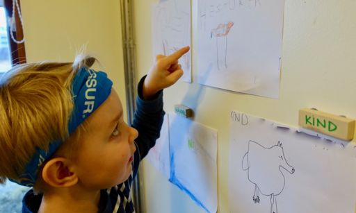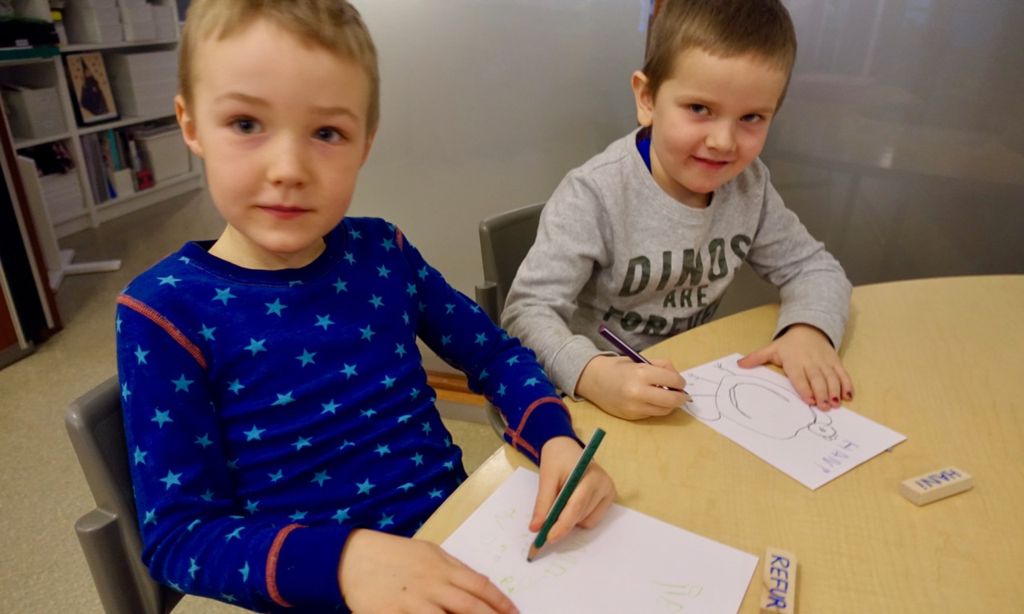 Þegar börnin fundu kubbinn sinn og áttuðu sig á hvaða dýr galdrakarlinn hafði breytt þeim í, fór fram smá læsisvinna. Hvert barn teiknaði dýrið sitt á blað og skrifaði nafn þess við myndina. Síðan skrifuðu þau eigið nafn líka svo að allir gætu séð hver fann hvað (og svo að við kennararnir gætum fylgst með því hvaða börn áttu ennþá eftir að finna dýrið sitt).