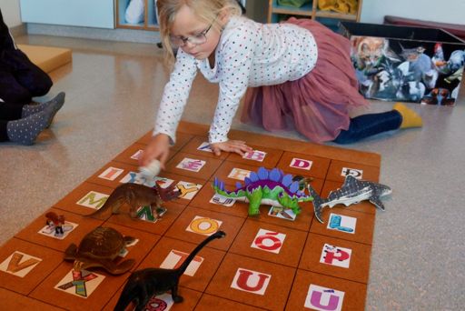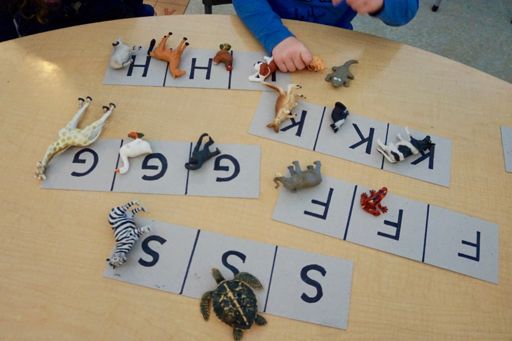 Hér eru börnin búin að finna dýr í dýrakassanum og raða þeim á stafaspjaldið okkar. Þetta er leikur sem er tilvalinn að nota í samverustund.