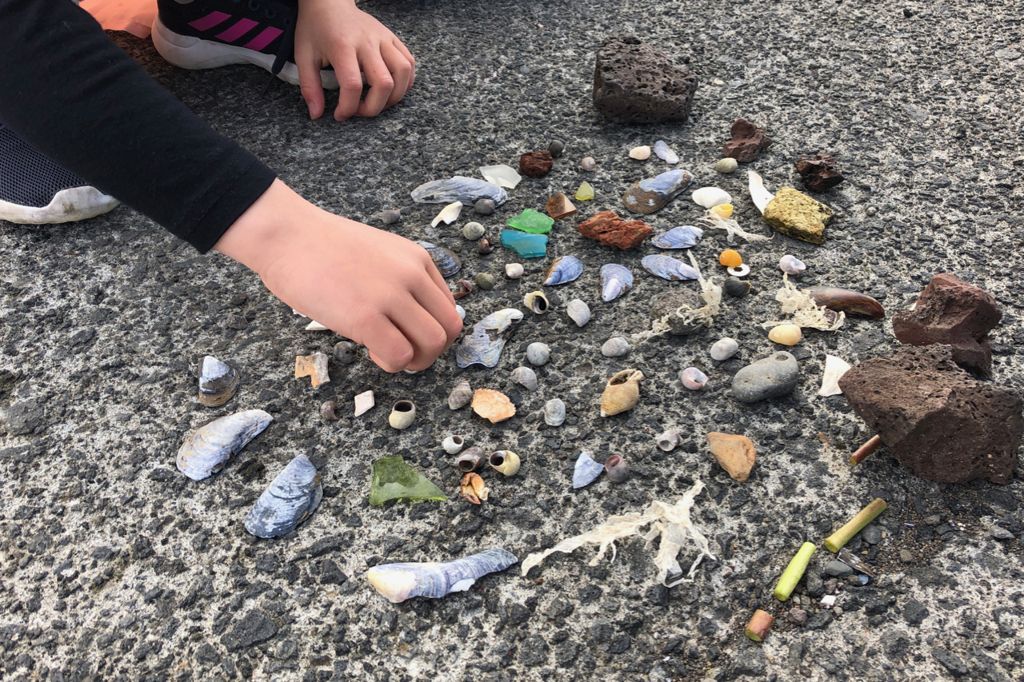 Börnin eru alltaf að safna hlutum í fjörunni. Gaman er að fá þau til að búa til sameiginleg listaverk úr þeim. Það er líka góð æfing í því að líta á hlutina sem sameign fremur en einkaeign.