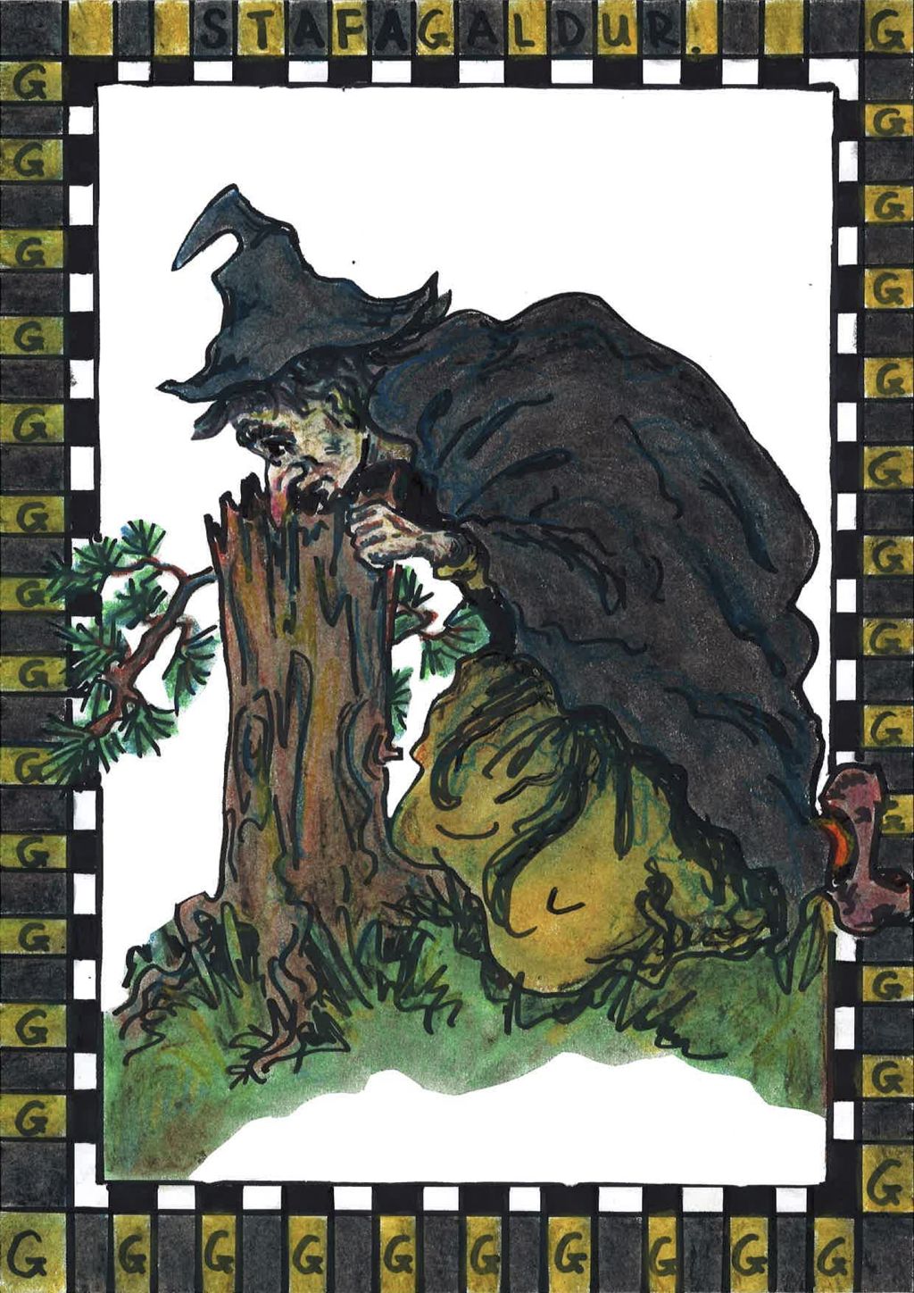 Í G-sögunni er það gömul galdranorn sem gefur barninu töfrapoka í þakkargjöf af því að barnið hjálpar henni að losa nefið úr trjástubbi.