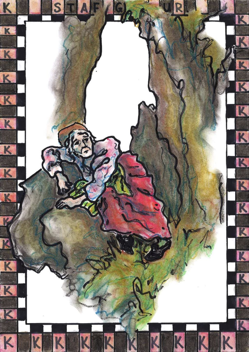 Í K-sögunni er það gömul kona sem gefur barninu töfrapoka í þakkargjöf af því að barnið hjálpar henni upp úr klettasprungu.