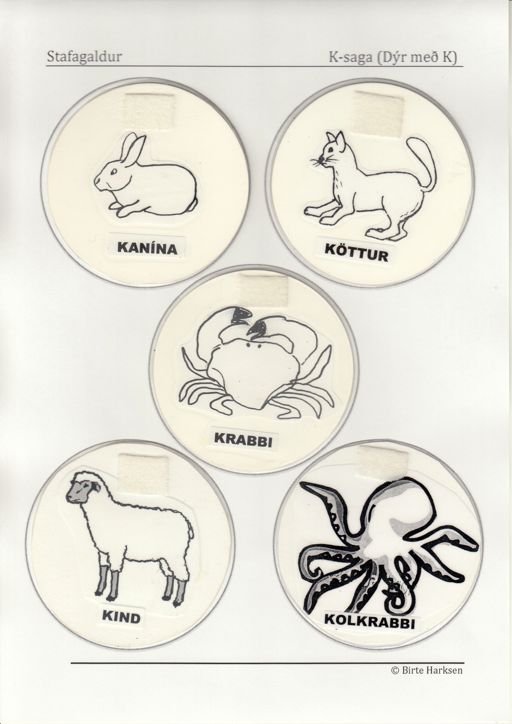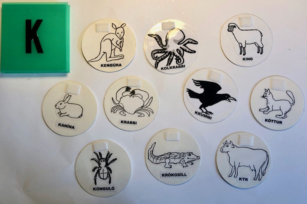 Á spjöldunum sem eru á kastalanum eru myndir af tíu dýrum sem byrja á K: Kanína, kónguló, kýr, krummi, kisa, krókódíll, kolkrabbi, krabbi, kengúra.