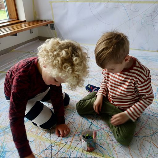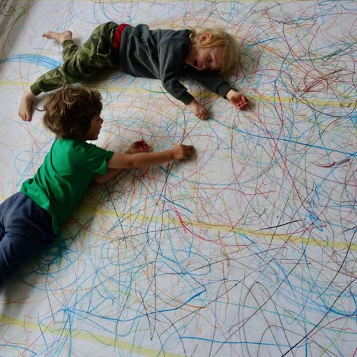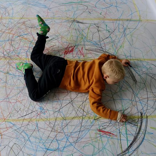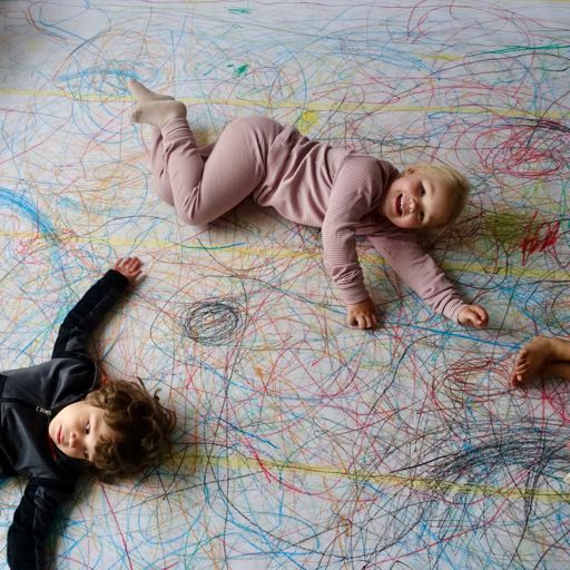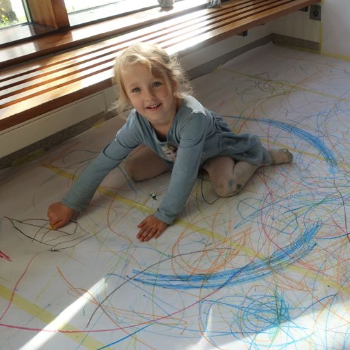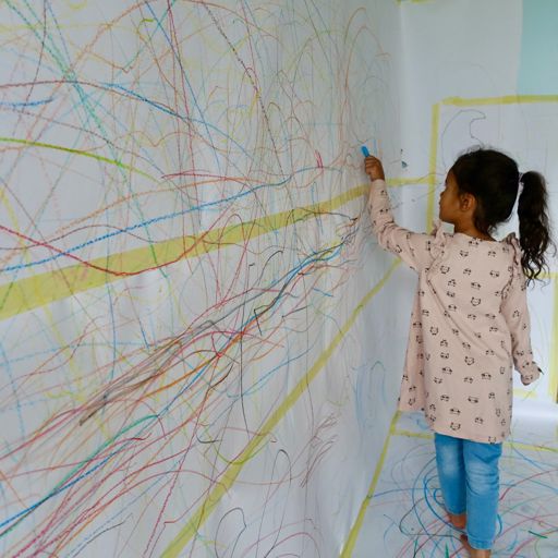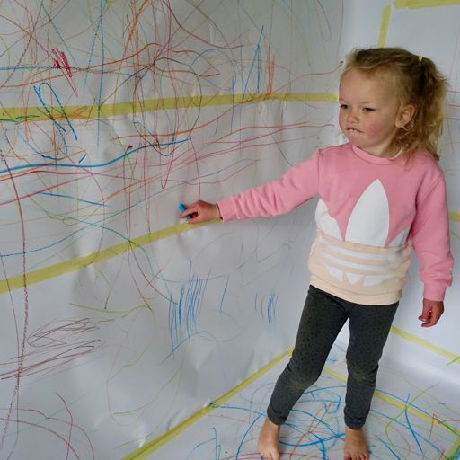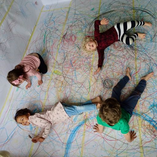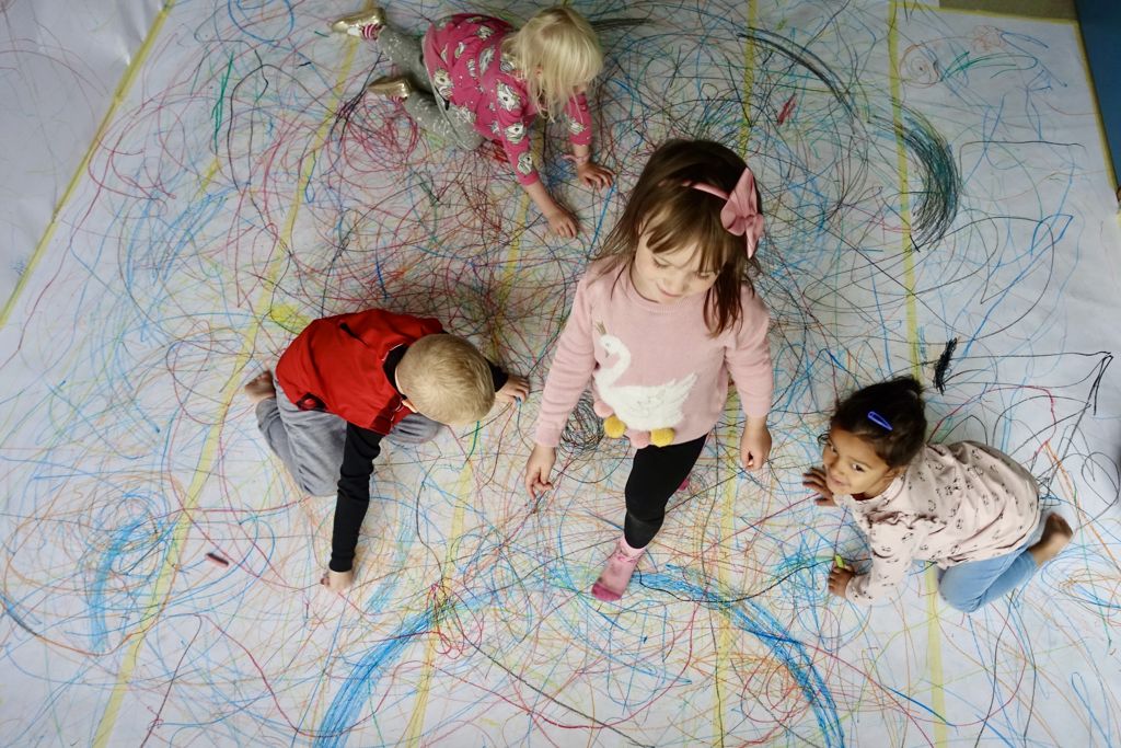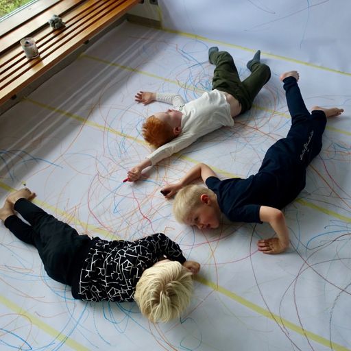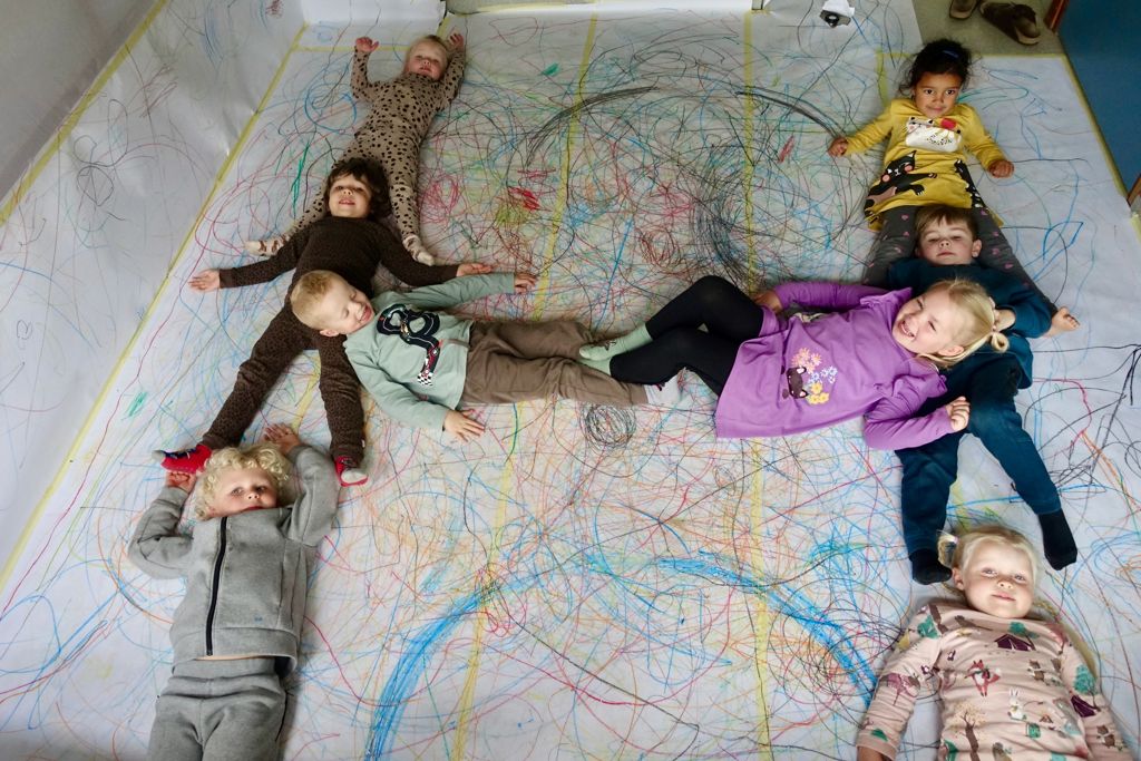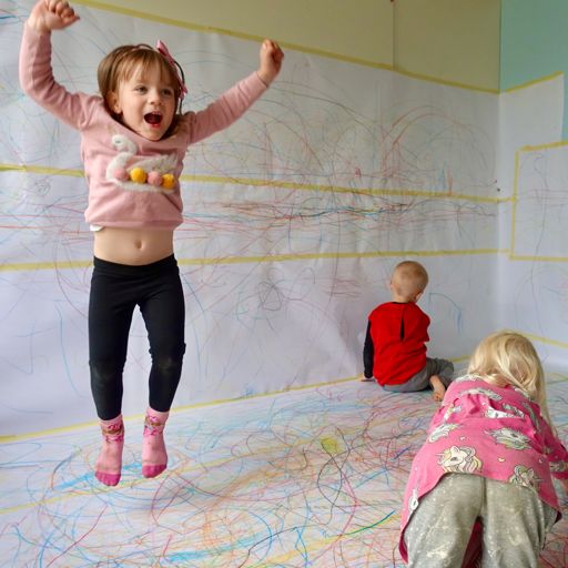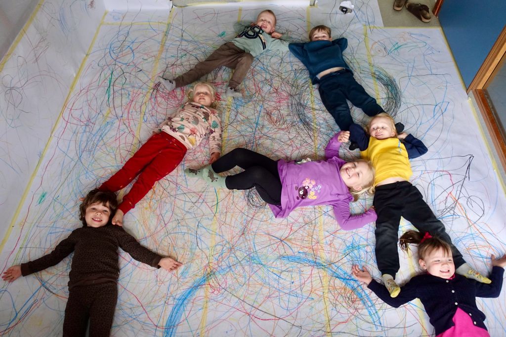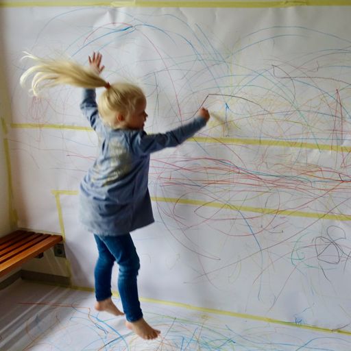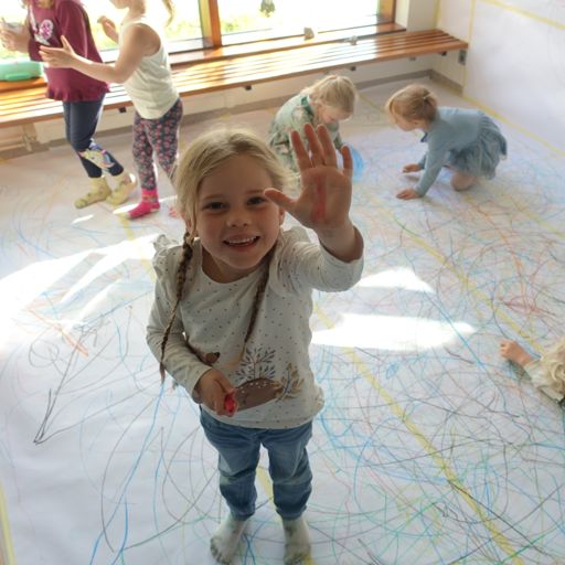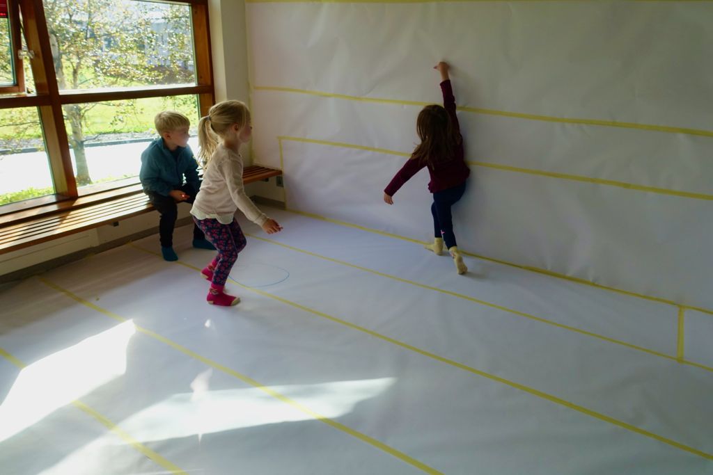 Það tekur að vísu smá tíma að undirbúa allt með því að þekja gólf og veggi með pappír en það er alveg þess virði. Til að börnin njóti sín sem best leyfum við þeim oft að fara inn í herbergið í litlum hópum og síðan er alveg nauðsynlegt að þau fái að hlusta á tónlist sem hvetur til hreyfingar - hvort sem hún er róleg eða lífleg.