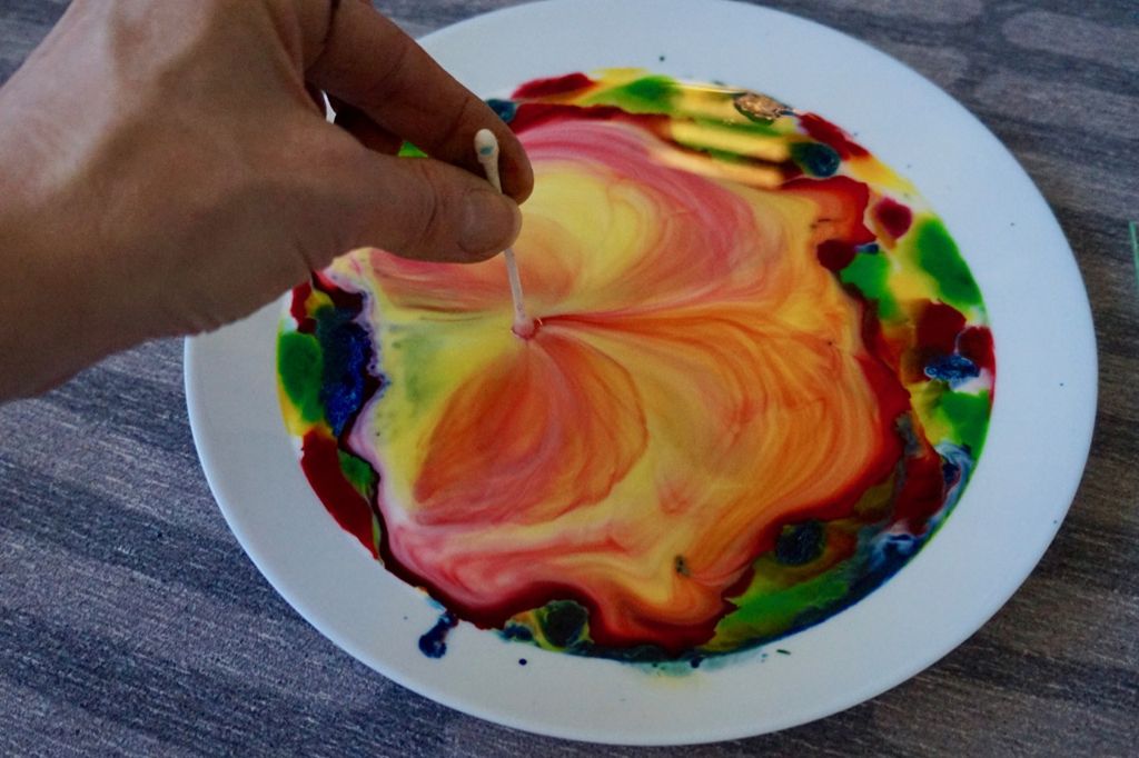 Þetta er vel þekkt tilraun sem er alveg heillandi að fylgjast með vegna þess hvernig litirnir hreyfast í mjólkinni. Maður hellir nýmjólk í disk, lætur nokkra dropa af matarlit út í (án þess að hræra) og dýfir svo eyrnapinna með uppþvottalegi í blönduna - og sér galdurinn gerast!