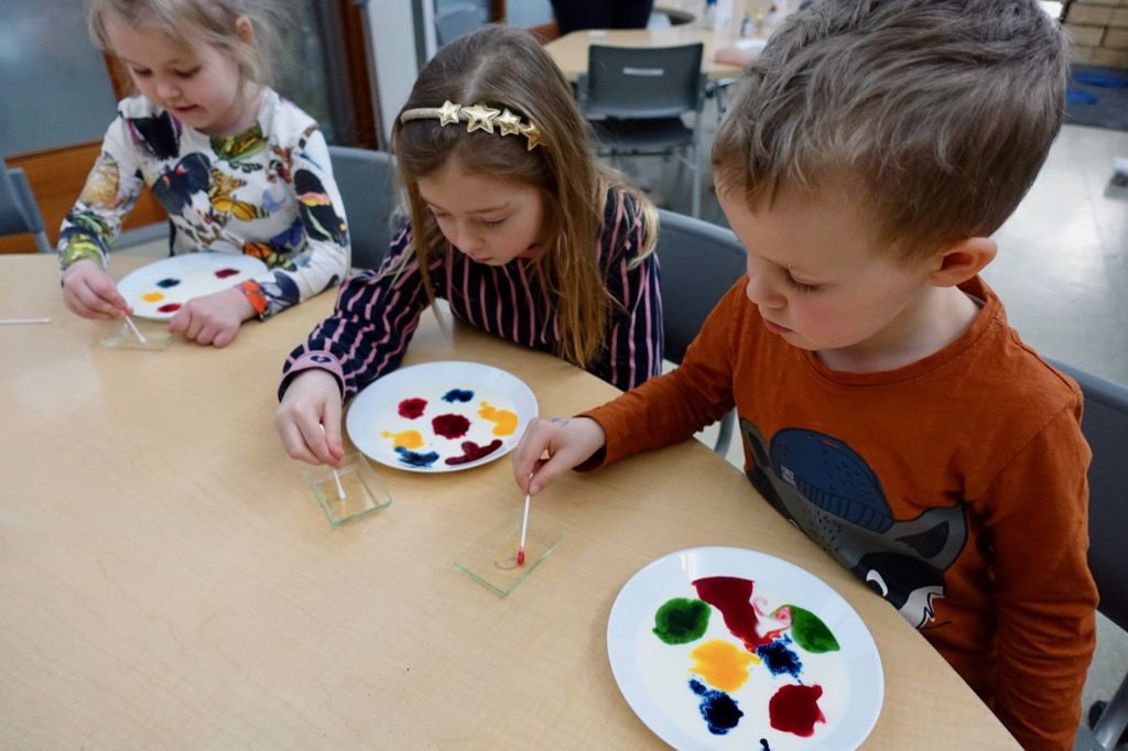 Það er mikilvægt að börnin skilji að þau þurfa að hreyfa eyrnapinnann ákaflega rólega í mjólkinni, því að annars blandast allir litirnir strax saman í óspennandi brúnan lit svo ekki verður aftur snúið.