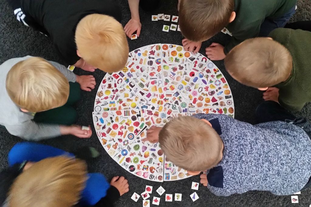 Börnin eru saman tvö og tvö. Hvert barn velur 5 myndspjöld og þau raða þeim svo í raðir með tvisvar sinnum fimm. Þau skoða hvaða 10 myndir þau eru með en velja síðan eina mynd sem þau ætla að byrja að á að leita að í pottinum. Þegar myndin er fundin leggja þau spjaldið ofan á hana og byrja að leita að næstu mynd.