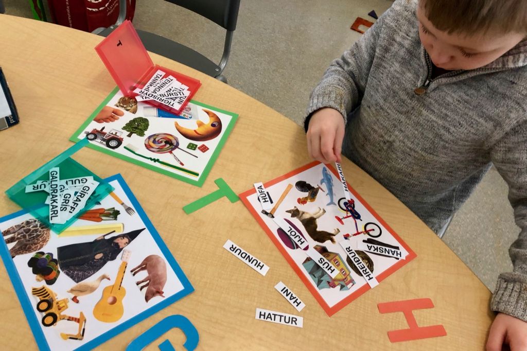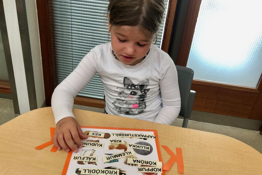 Þessi æfing hentar best fyrir elstu börnin sem eru nálægt því að verða læs. Á myndaspjöldunum eru tíu myndir sem byrja á sama bókstaf, og orðin eru síðan á sérspjöldum. Börnin finna út hvaða orð passa við hvaða myndir og leggja síðan orðið ofan á viðeigandi mynd.
