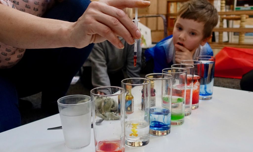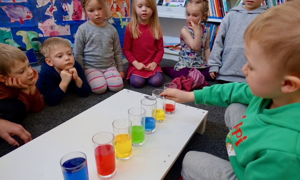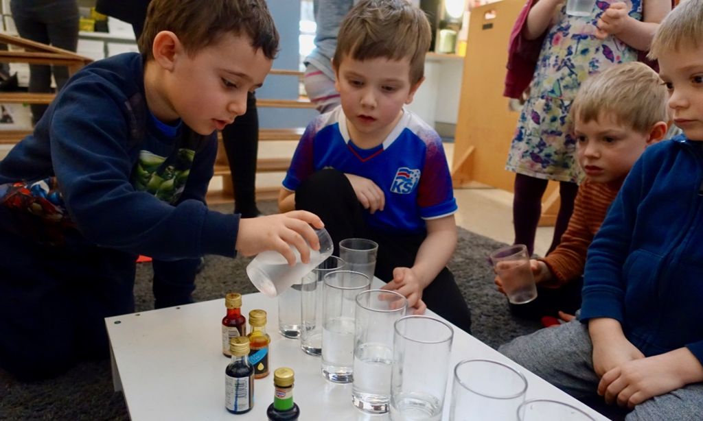 Vinnustundin í þessari viku var helguð vísindatilraunum og við gerðum þrjár mismunandi tilraunir úr Stóru tilraunabókinni sem allar voru með vatni og matarlit. (Ég mæli með að kennarinn sjái um matarlitinn svo að hann fari ekki óvart í fötin).