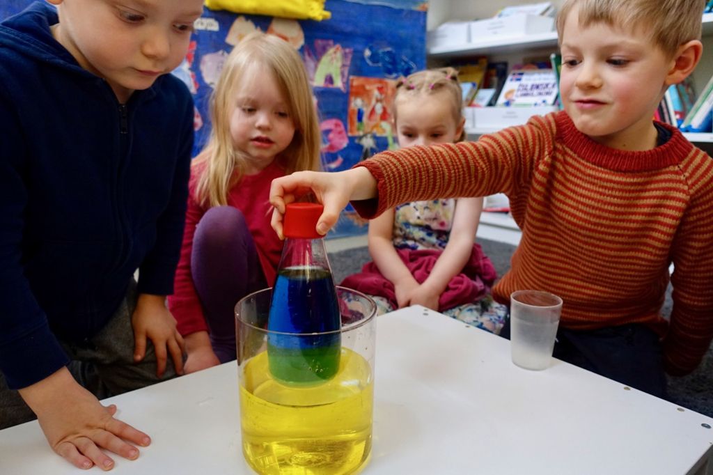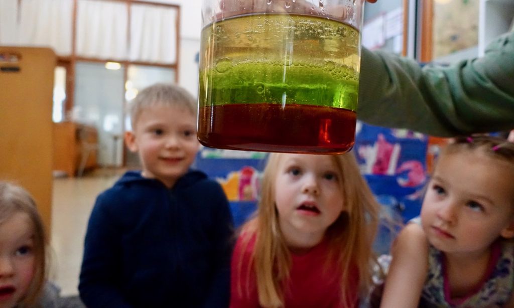 Fyrst síróp, síðan olía og svo græna vatnið. Börnin voru hissa þegar vatnið fór undir olíuna.