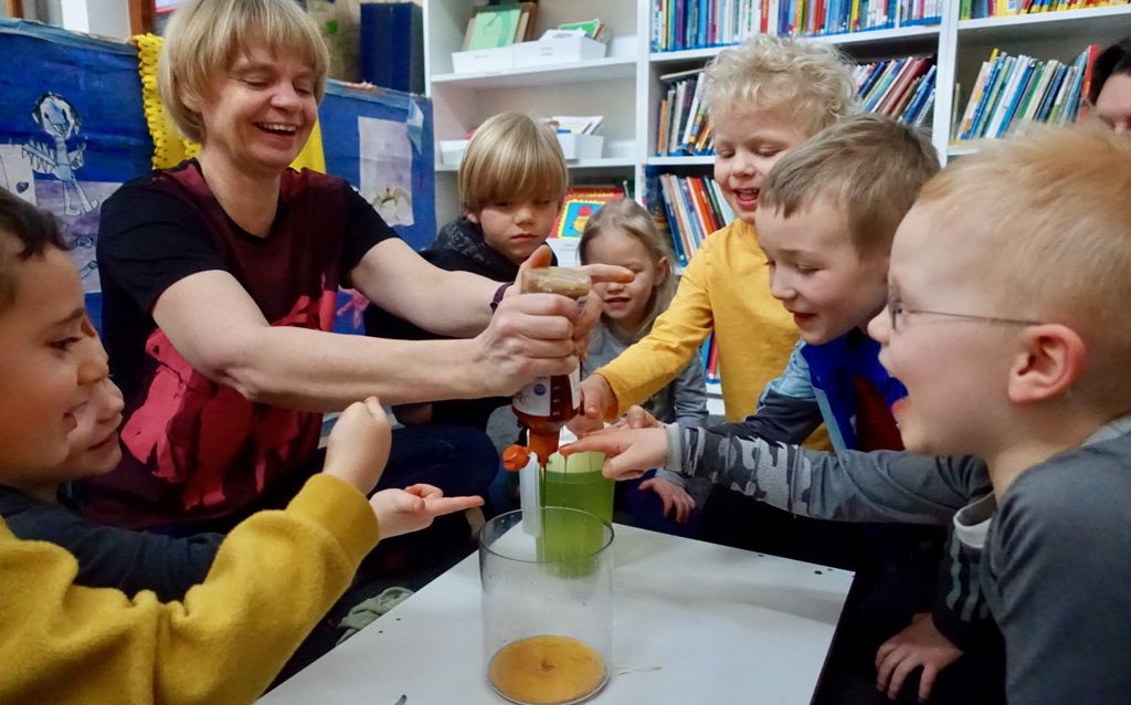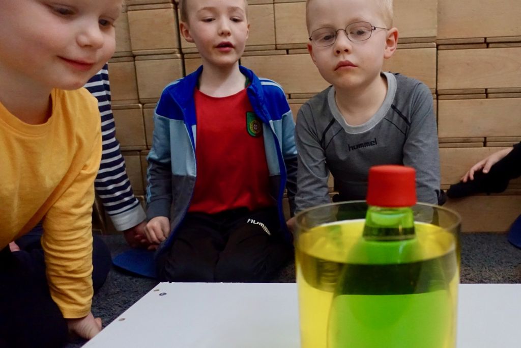Börnin fengu öll að setja flöskuna með bláu vatni ofan í gula vatnið.