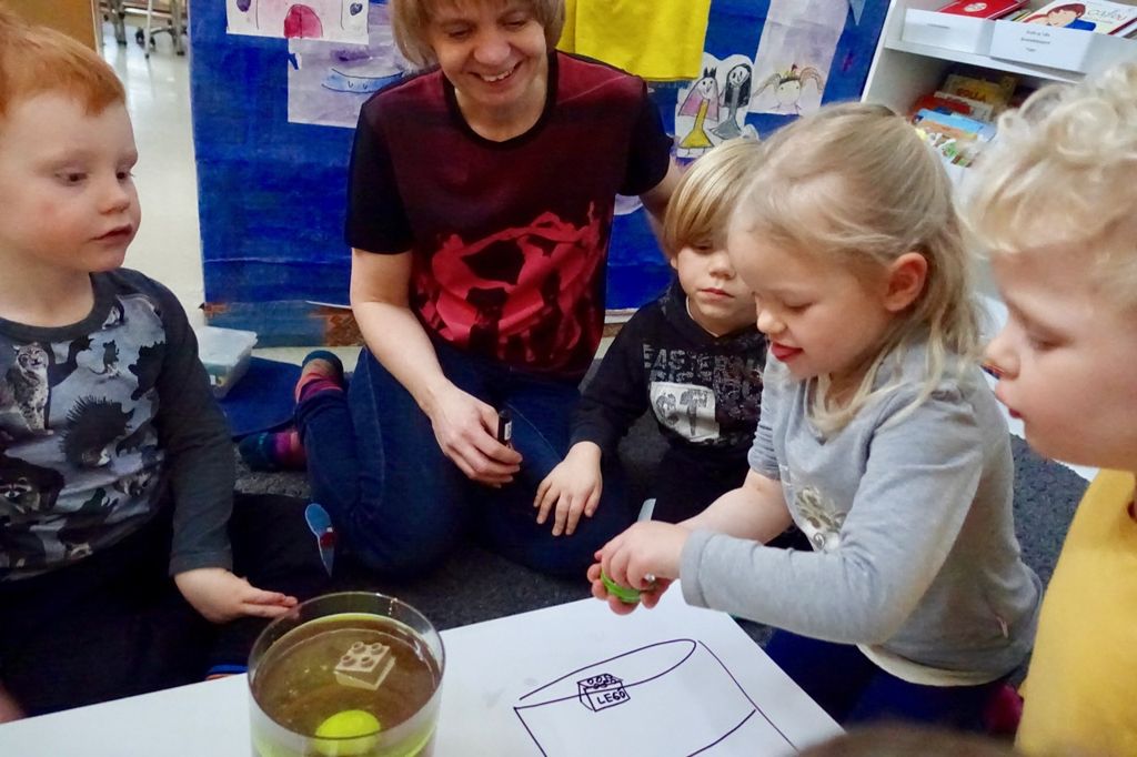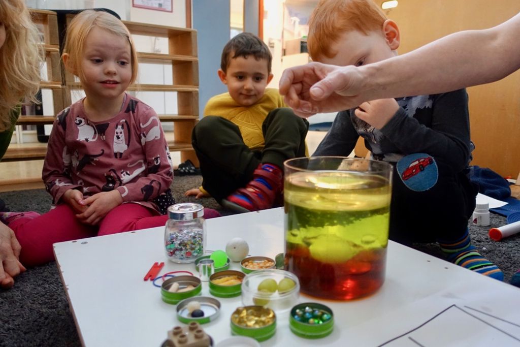 Börnin skiptust á að setja hlut í krukkuna og giska á hvar hann myndi fljóta. Við teiknuðum það síðan upp.