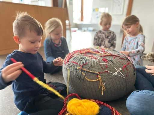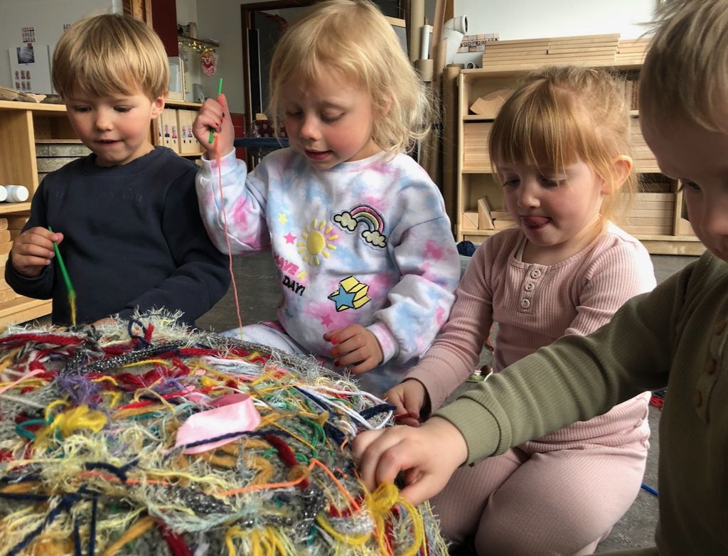 Við erum með körfu fulla af mislitu garni og börnin velja sér sjálf lit. Stundum þurfa þau smá aðstoð við að þræða "nálarnar" en annars eru þau mjög sjálfstæð í ferlinu. Það er engin fyrirmynd og engar reglur, og börnin mega koma og fara eins og þau vilja. Ef það eru fleiri börn en nálar, þá geta þau alveg verið tvö og tvö saman og hjálpast að.