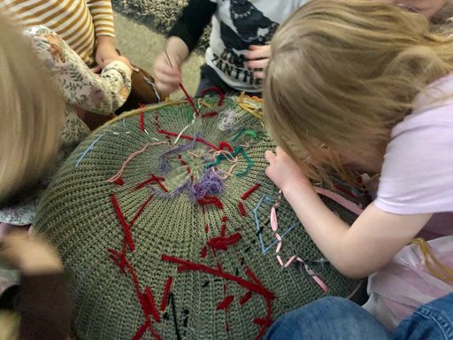 Fallegi töfrapúðinn okkar er orðinn sannkallað listaverk í þrívídd. Galdurinn er ofinn þráð fyrir þráð inn í gamla, gráa IKEA-púðann og útkoman hefur orðið sífellt fallegri gegnum margra mánuða saumaskap í samvinnuverkefni barna af mörgum deildum. Töfrapúðinn er í sífelldri þróun og verkefnið getur haldið endalaust áfram. Þegar maður horfir á myndskeiðið skynjar maður að raunverulegu töfrarnir felast tvímælalaust í því hvað töfrapúðinn hefur róandi og slakandi áhrif á alla sem sitja saman við hann og sauma.