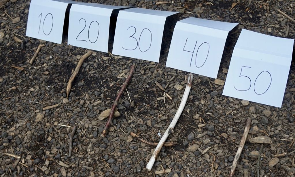 Til að blanda smá stærðfræði inn í þetta sagði ég börnunum þegar þau voru að leita sér að priki að þau mættu velja sér prik sem væri allt frá 10 og upp í 50 sentimetrar að lengd. Ég setti upp spjöld sem á stóð "10", "20", "30", "40" og "50" og hjá þeim prik í þeirri lengd. Þannig gátu börnin borið þau prik sem þau fundu saman við þessar fyrirmyndir og fundið út lengdina á því priki sem þau höfðu valið.
