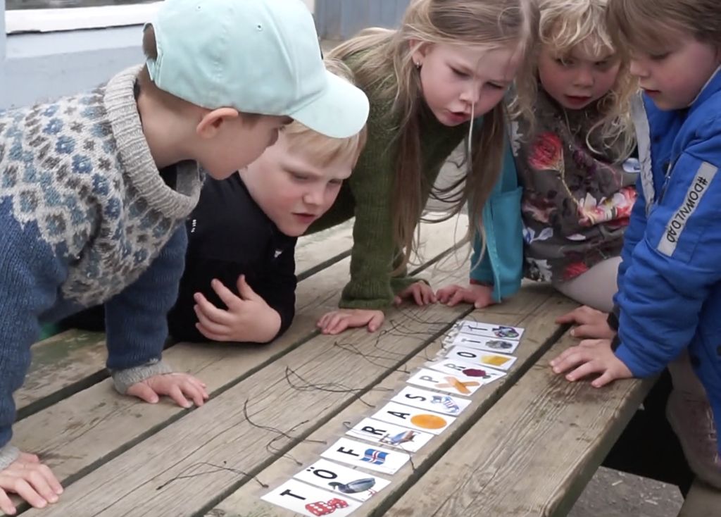 Ég bjó til stafaspjöld með bókstaf og mynd saman. Þau voru síðan plöstuð og falin á ýmsum stöðum á leikvellinum. Þar sem börnin voru einmitt 11 ákváðum við að allir mættu finna eitt spjald. Eins og sjá má í myndskeiðinu hér að neðan gekk þeim mjög vel að koma sér síðan saman um hvaða orð stafirnir mynduðu.