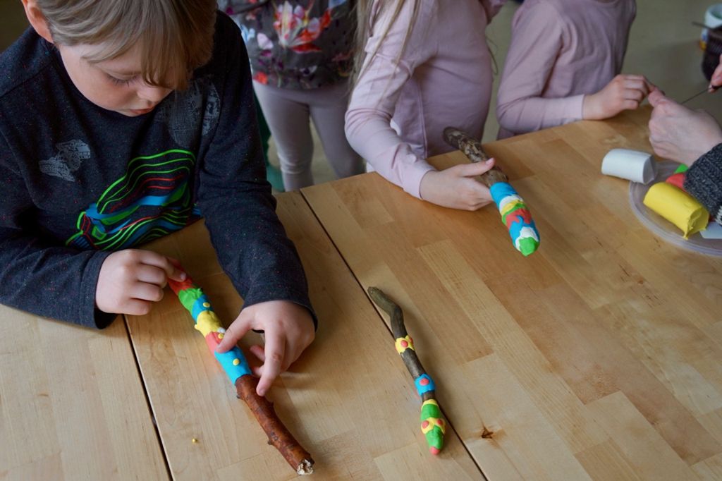 Nú hófst vinnan við að skreyta prikin og breyta þeim í töfrasprota. Við keyptum thermo-leir í ABC Skólavörum og vorum með fjóra mismunandi liti sem börnin vöfðu eða þrykktu um sprotana sína og reyndu að búa til skemmtileg mynstur.