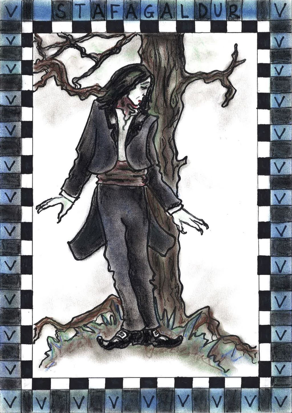 Í V-sögunni er það vampíra sem gefur barninu töfrapoka í þakkargjöf af því að barnið hjálpar henni að finna gervivígtennurnar hennar Smellið á myndina til að opna hana í fullri stærð ef þið viljið t.d. prenta hana.